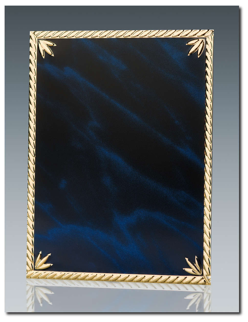 Glastrophäe kombiniert mit blau marmorierter Ehrentafel aus Aluminium mit goldfarbigem Zierrand.