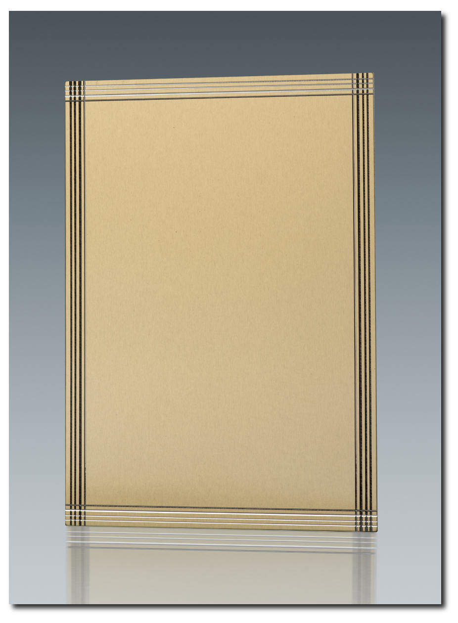 Hochwertige, goldfarbige Ehrentafel aus Aluminium, gebürstete Oberfläche und Zierrand, moniert auf Glastrophäe.