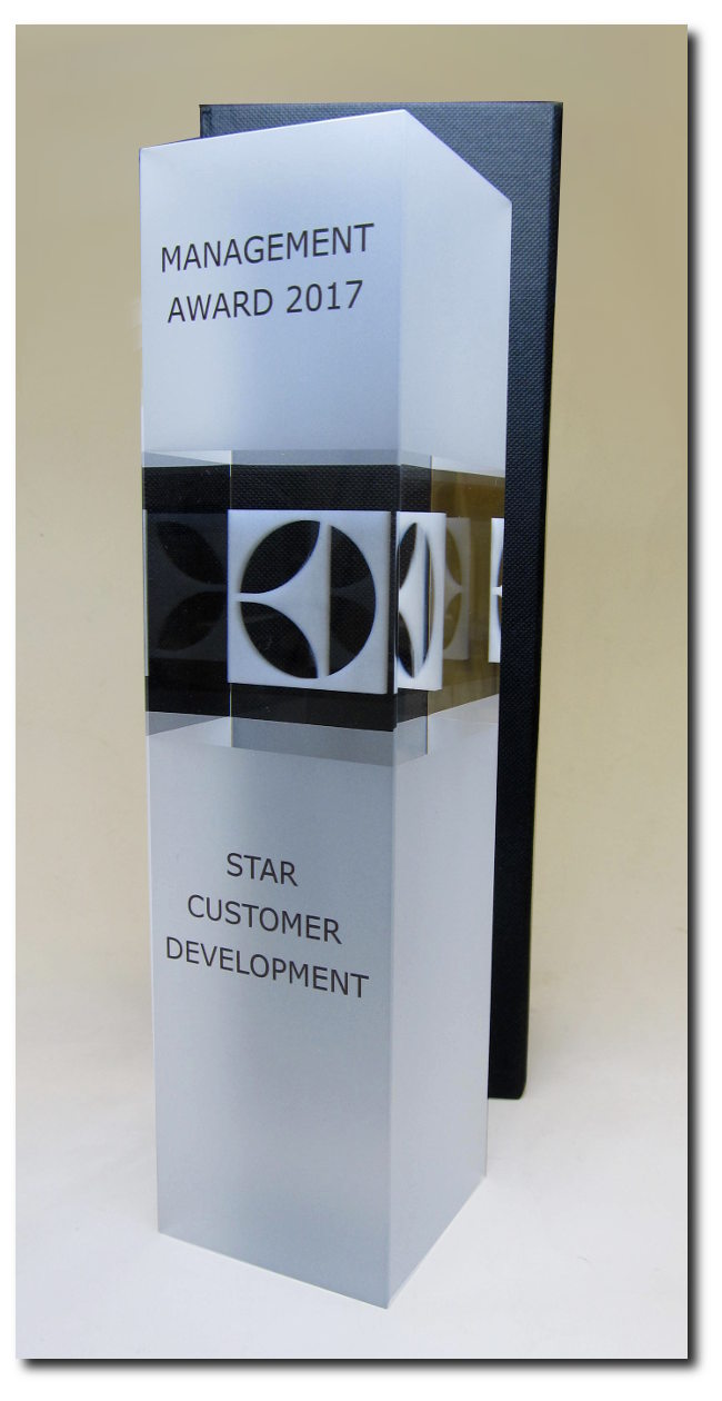 Vielleicht der eleganteste Glasaward aus unserer Cubix Kollektion. Klares Kristallglas in der Mitte, der obere und der untere Glasteil sind sandgestrahlt.
