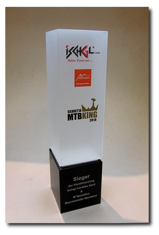 Der Kontrast des massiven schwarzen Sockels, in Kombination mit der feinen sandgestrahlten Oberfläche, lässt die Trophäe regelrecht leuchten.