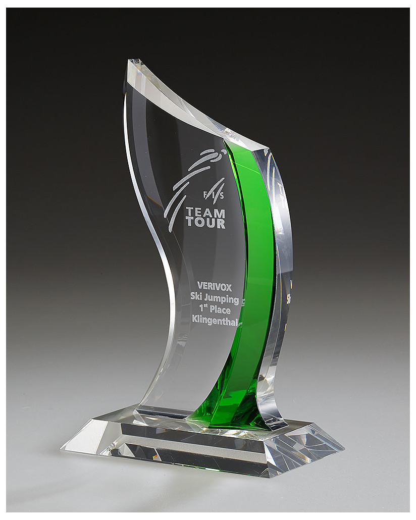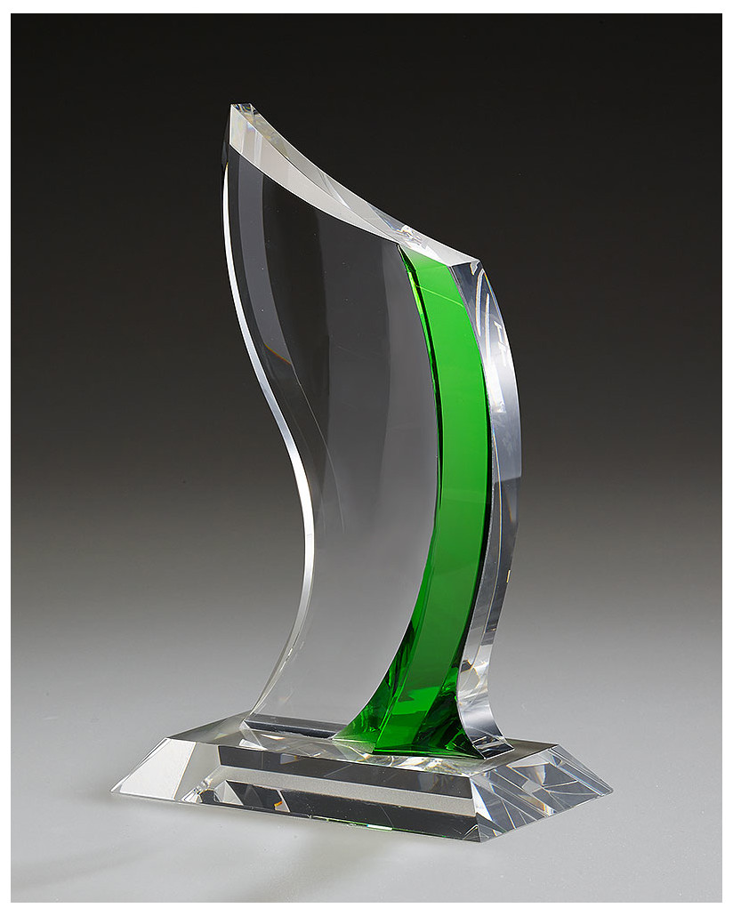 Geschwungener Glaspokal mit grünem Glaselement. Ein Glasaward der sich schlichtweg elegant und einzigartig präsentiert. Veredelt wird der Glaspokal mit einer Lasergravur