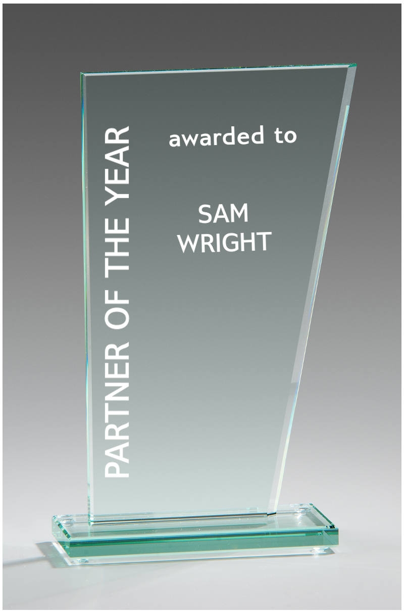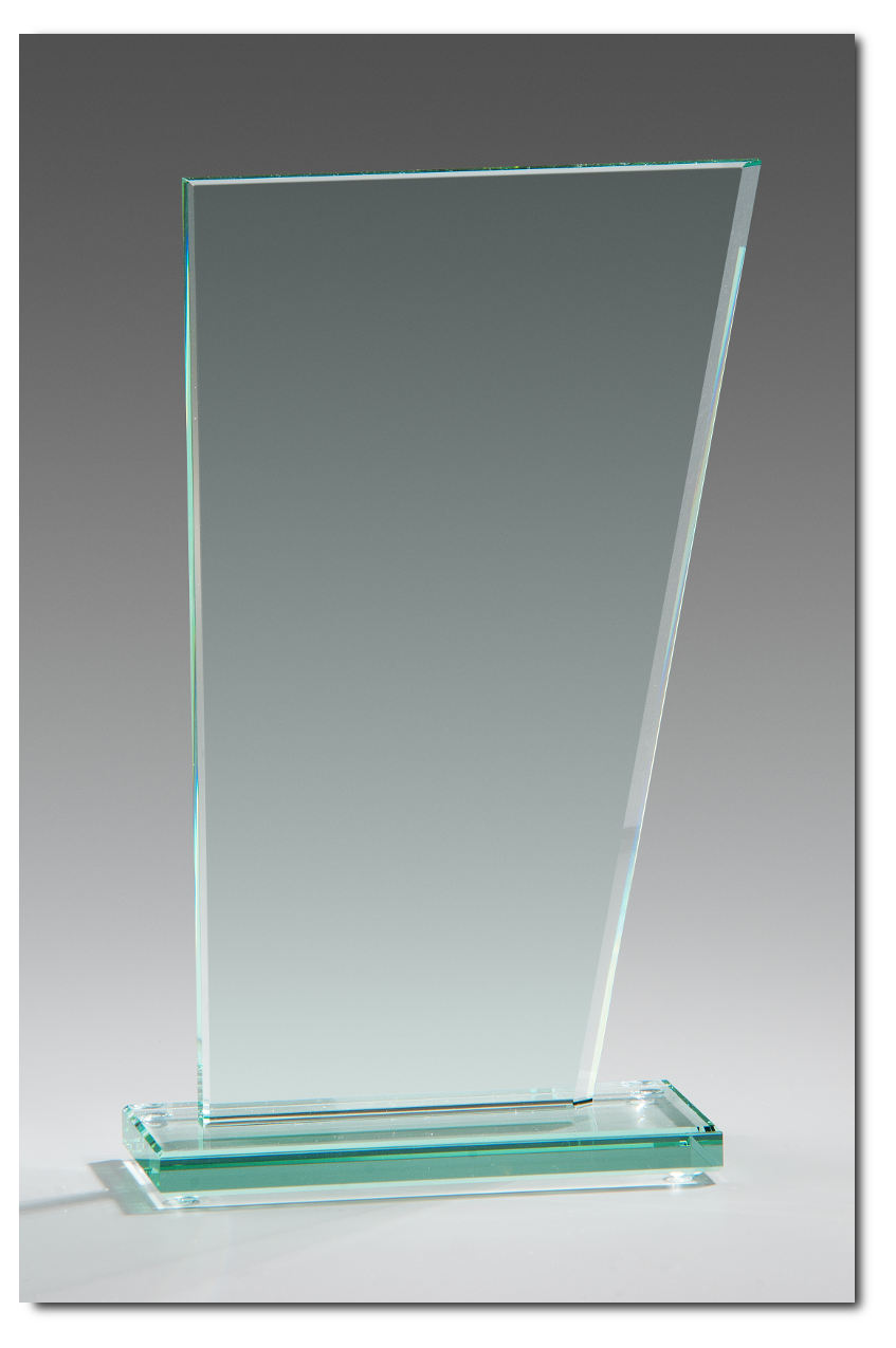 Günstige Glastrophäe aus Jadeglas - grün schimmernd. Die Glastrophäe kann mit einer Lasergravur und UV-Druck versehen werden.