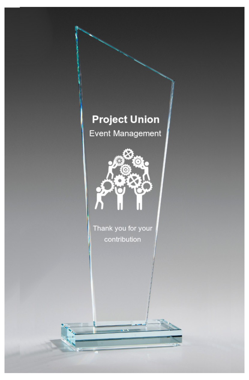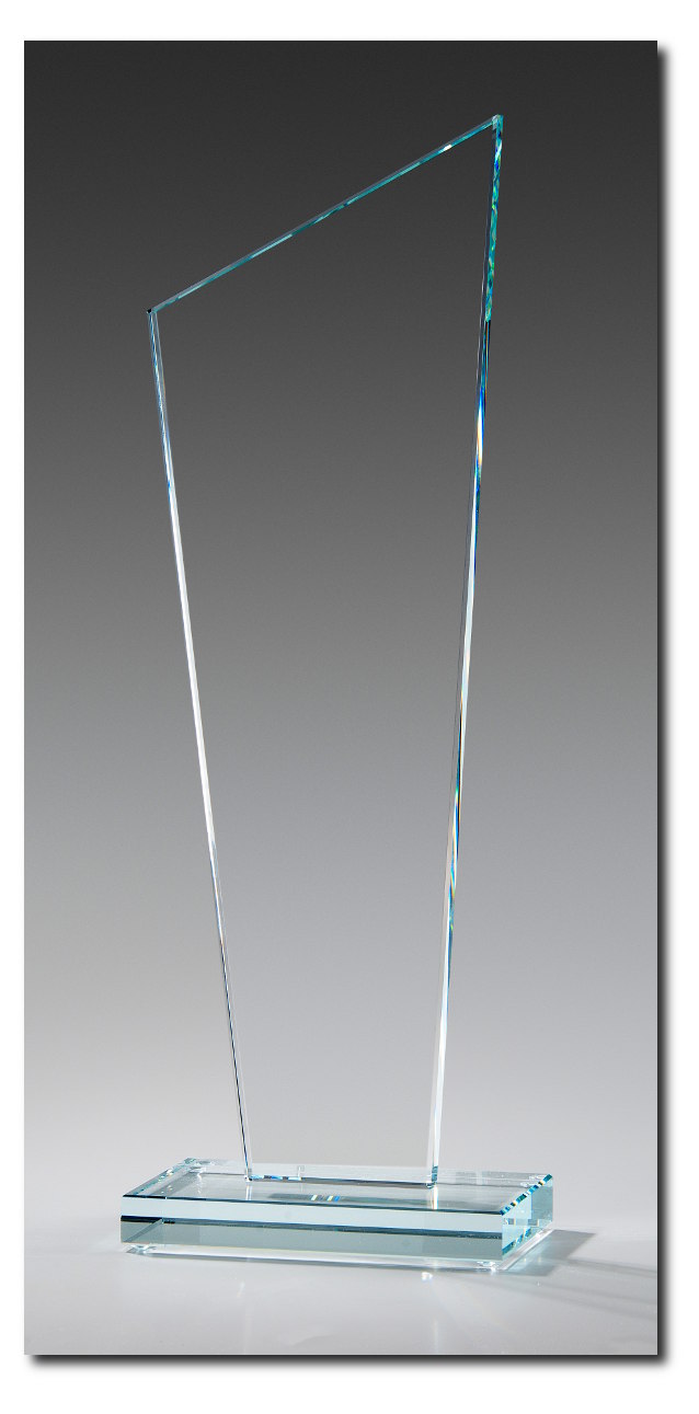 HOHE Glastrophäe im modernem Design und 12mm hohem Glassockel. Veredelt werden kann diese Glastrophäe mit einer Lasergravur und/oder hochwertigem UV Druck