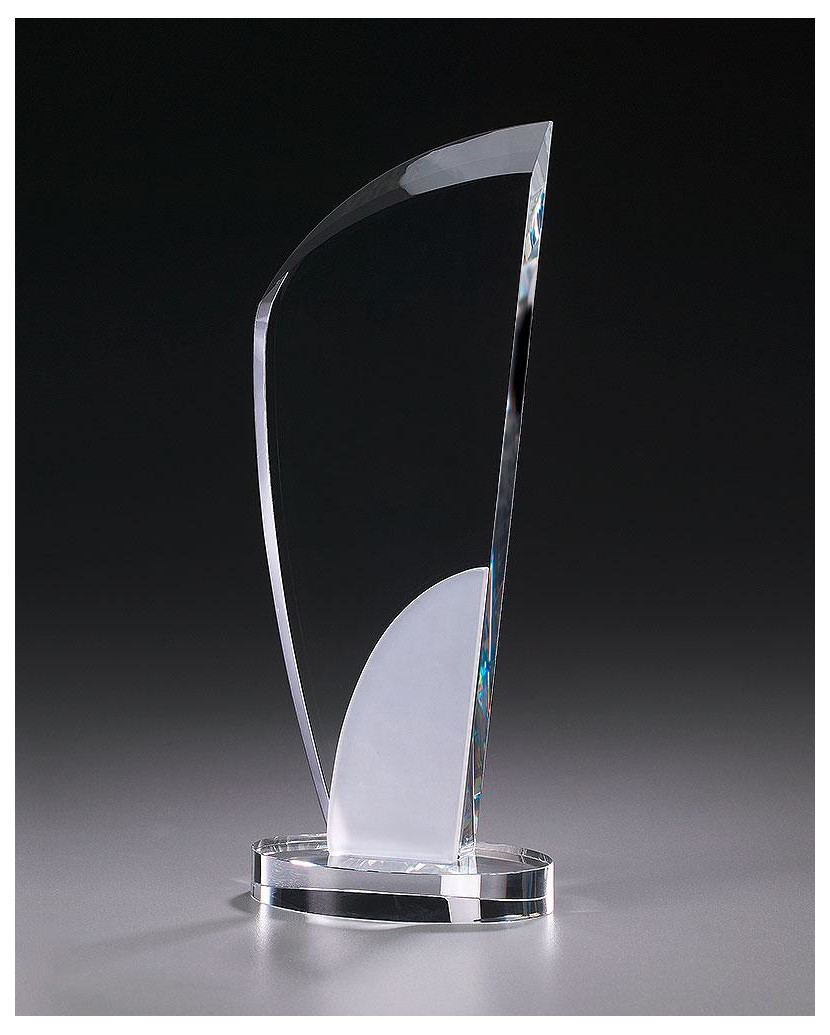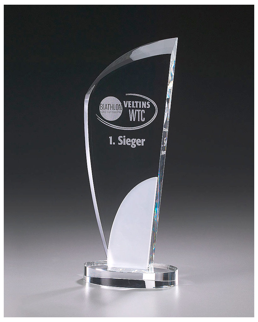 Eleganter Glaspokal aus hochwertigem Kristallglas mit Diamantschliff, satiniertem Glasauschnitt und ovalem Glassockel. Für alle die auf das Besondere Wert legen. Die Glastrophäe kann mittels Lasergravur und/oder UV-Druck veredelt werden.