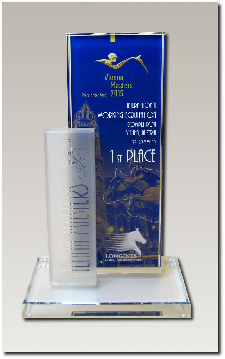 Hohe Glastrophäe bestehend aus 2 verschieden grossen Glasteilen, die individuell graviert oder bedruckt werden können. Der hintere Glasteil kann mittels Lasergravur und/oder UV-Druck personalisiert werden - der vordere, sandgestrahlte Teil wird mittels UV-Druck veredelt.