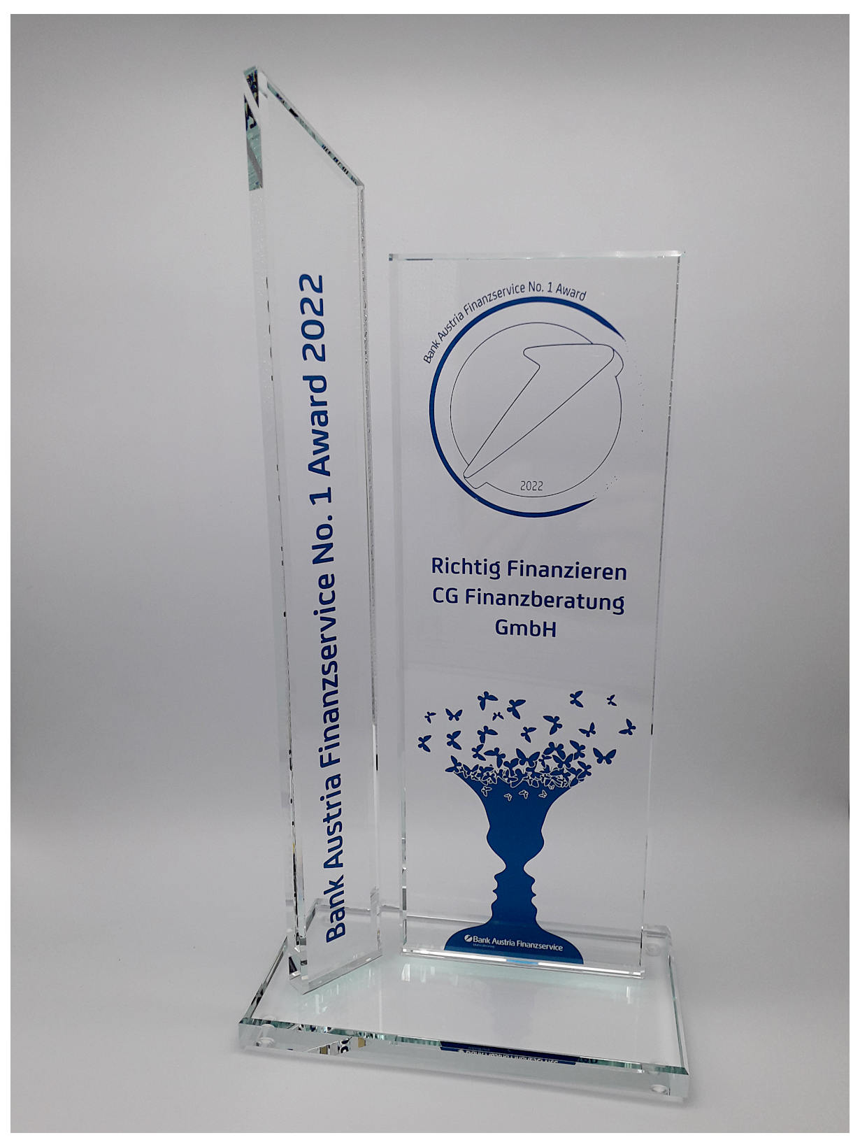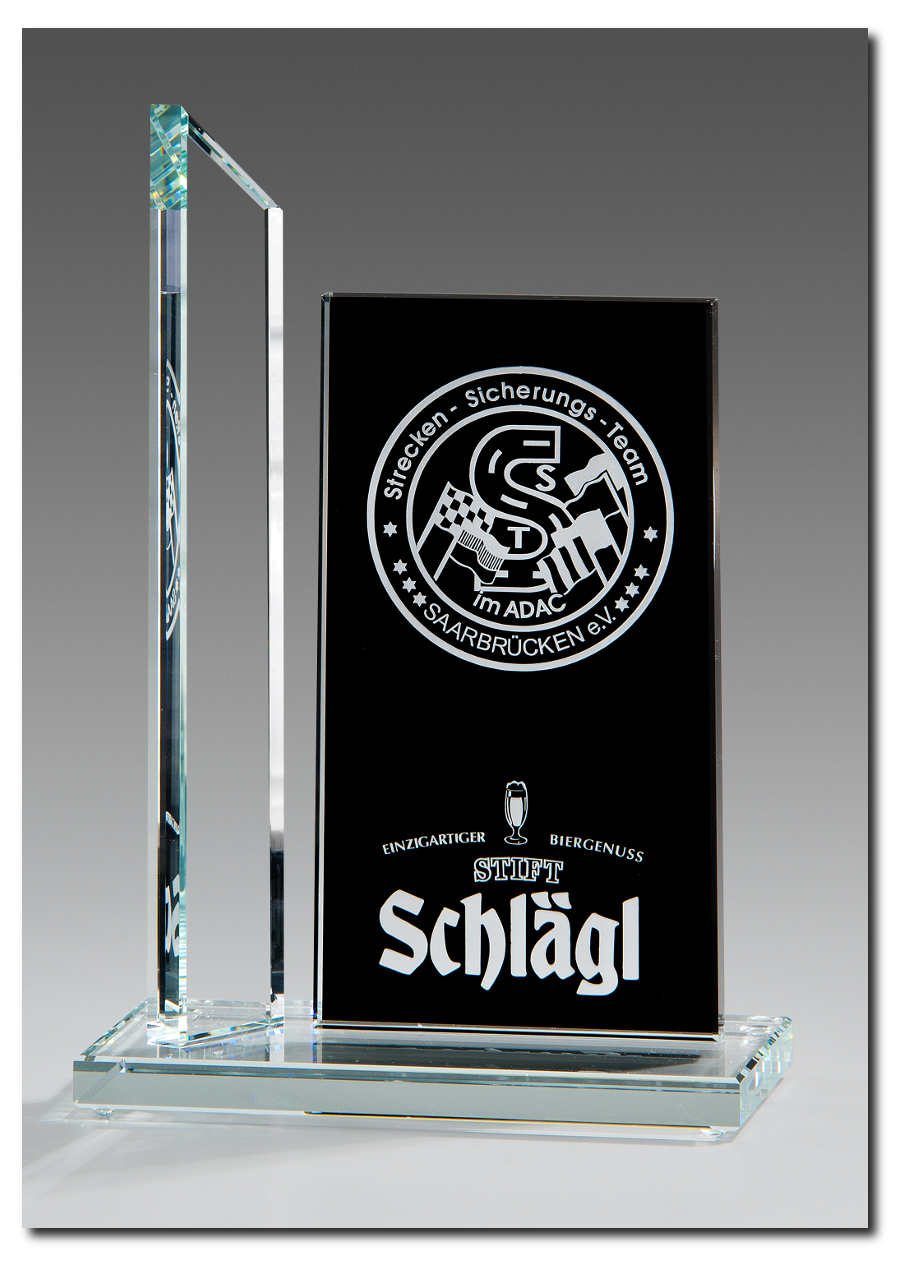 Glastrophäe bestehend aus 2 Teilen. Beide Glasteile können individuell mit ihrer persönlichen Widmung versehen werden.