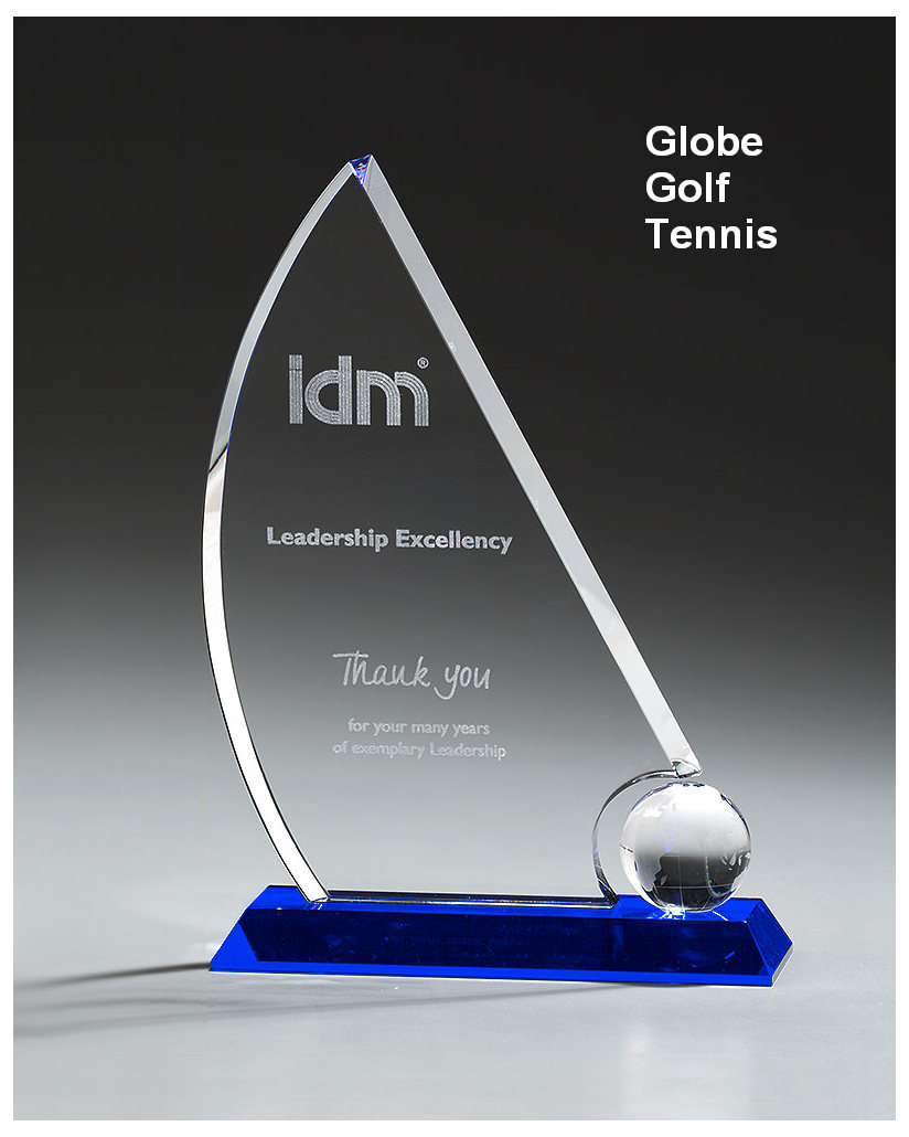 Elegant und anmutig sticht diese Golftrophäe ins Auge. Verstärkt wird diese exklusive Optik durch den tiefblauen Kristallglas-Sockel. Der Glasball fügt sich harmonisch ein und verstärkt die Wirkung und das Aussehen dieses tollen Awards. Die Veredelung der Glastrophäe erfolgt mittels Lasergravur.