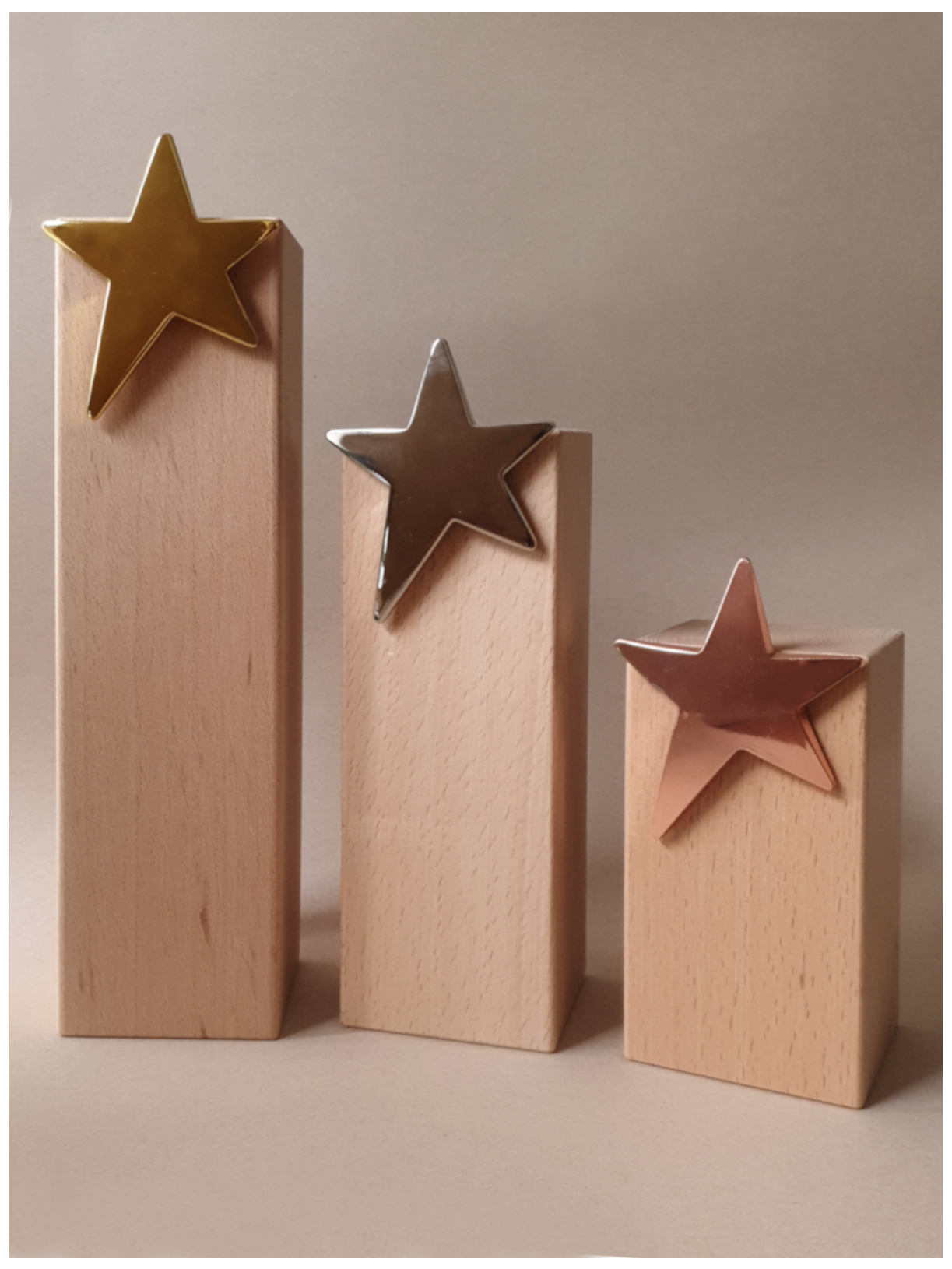 Eleganter Pokal aus Buchenholz mit 8cm Metallstern ( gold, silber, bronze ). Die Holztrophäe ist aus nachwachsenden Rohstoffen gefertigt und ist besonders geeignet für Ehrungen und Verleihungen die Naturverbundenheit und Nachhaltigkeit ausstrahlen wollen.