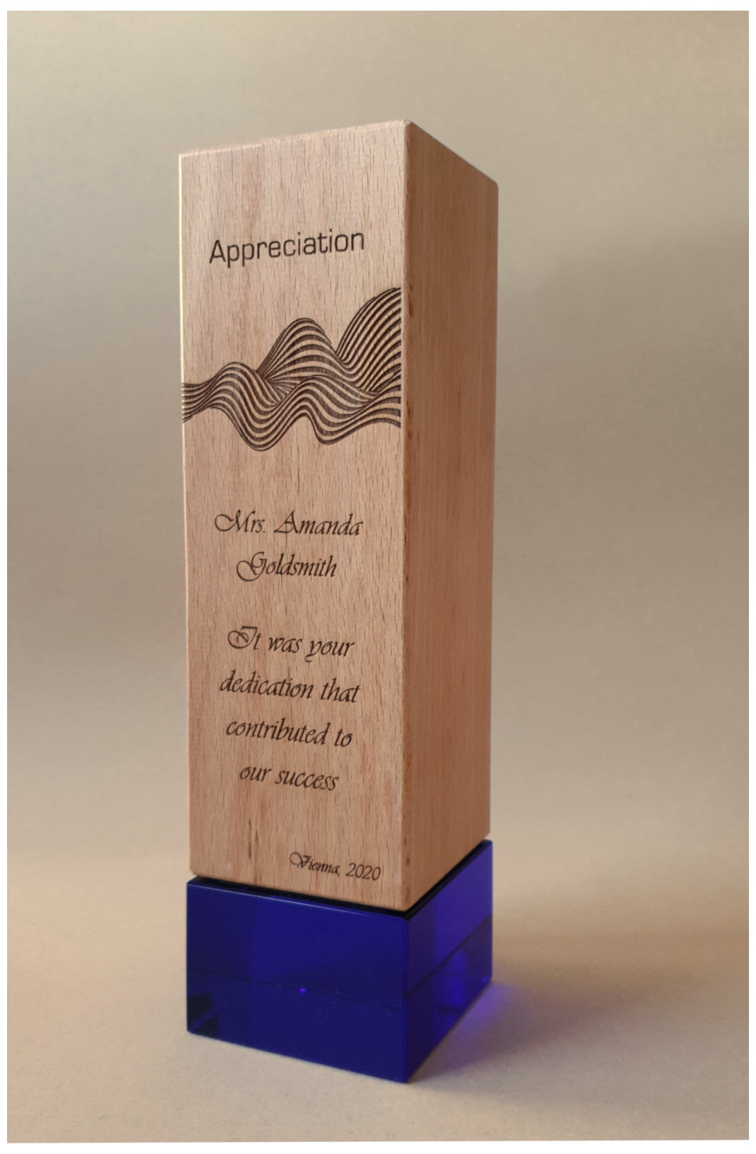 Eleganter Holzaward aus Buchenholz mit 3cm hohem blauen Glassockel. Ein Naturprodukt geeignet für viele Anlässe.