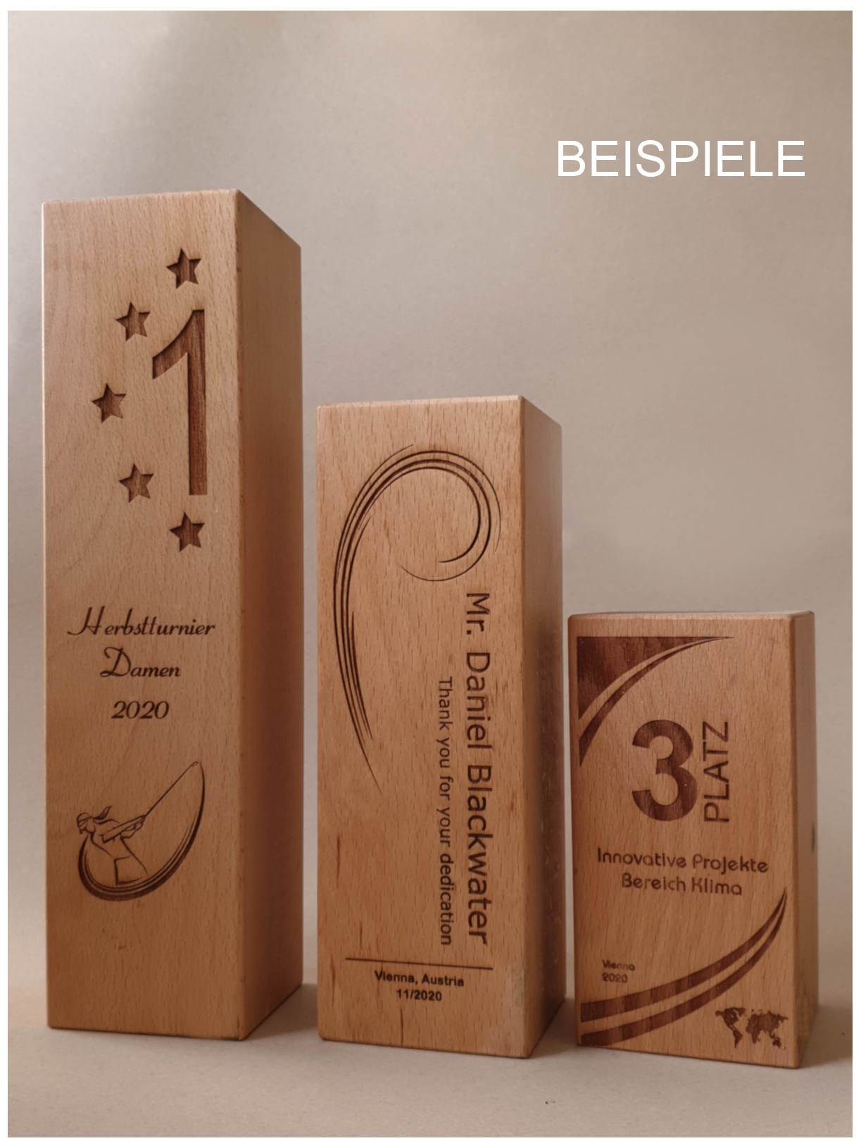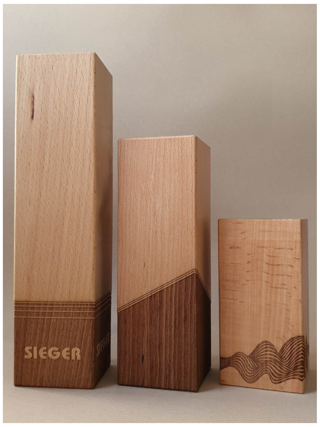 Die Holztrophäe wird in unserer eigenen Produktion nach ihren individuellen Wünschen veredelt. Die Veredelung erfolgt mittels UV-Druck und/oder Lasergravur.