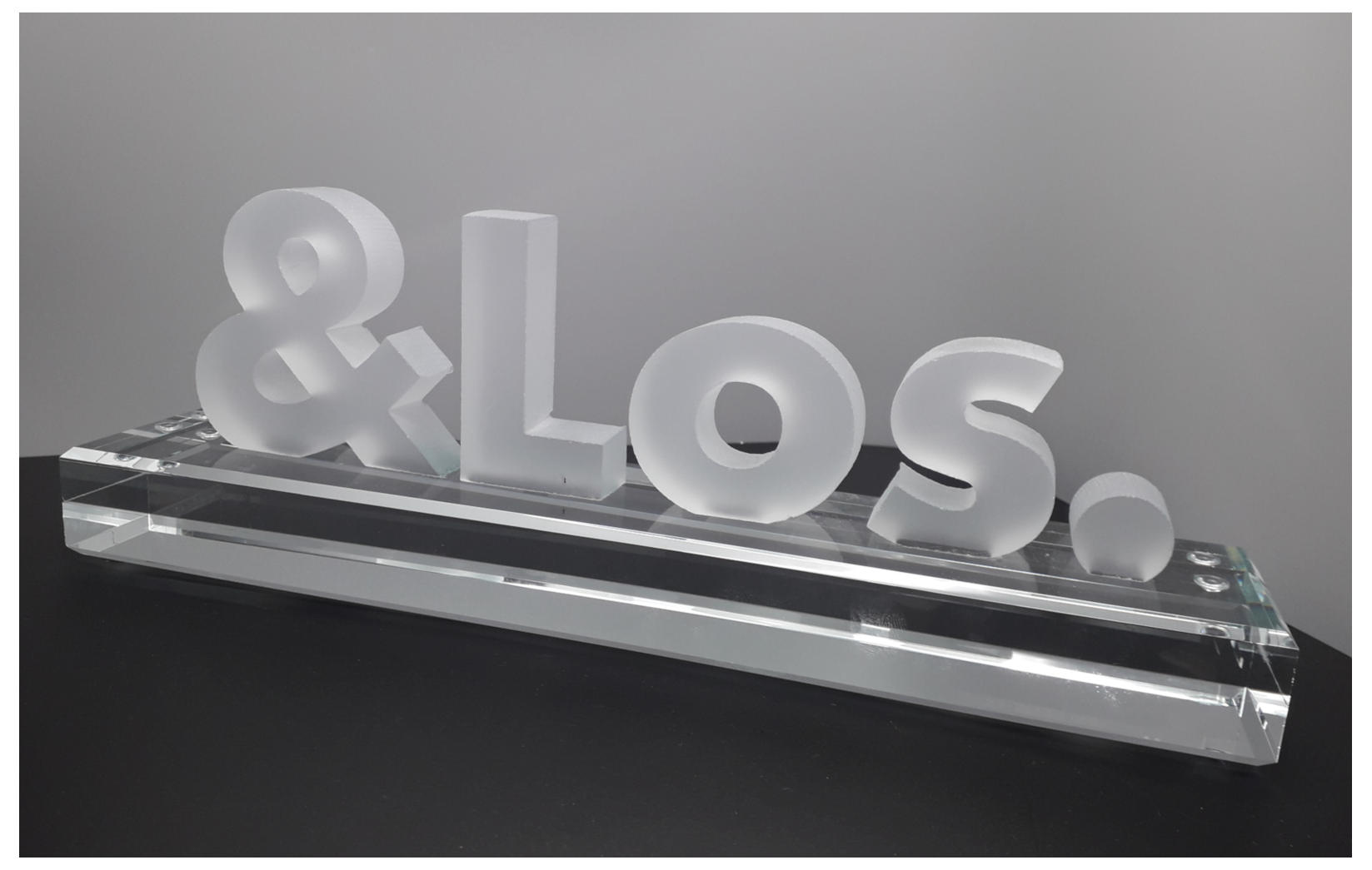 Sonderanfertigung aus Glas bestehend aus ausgeschnittenen, sandgestrahlten Buchstaben und Sonderzeichen auf einem 3cm hohem Glassockel montiert.