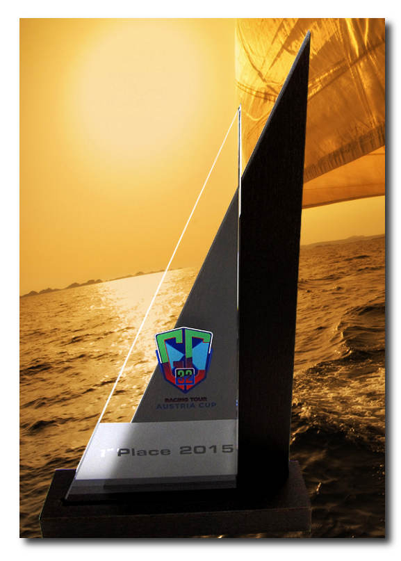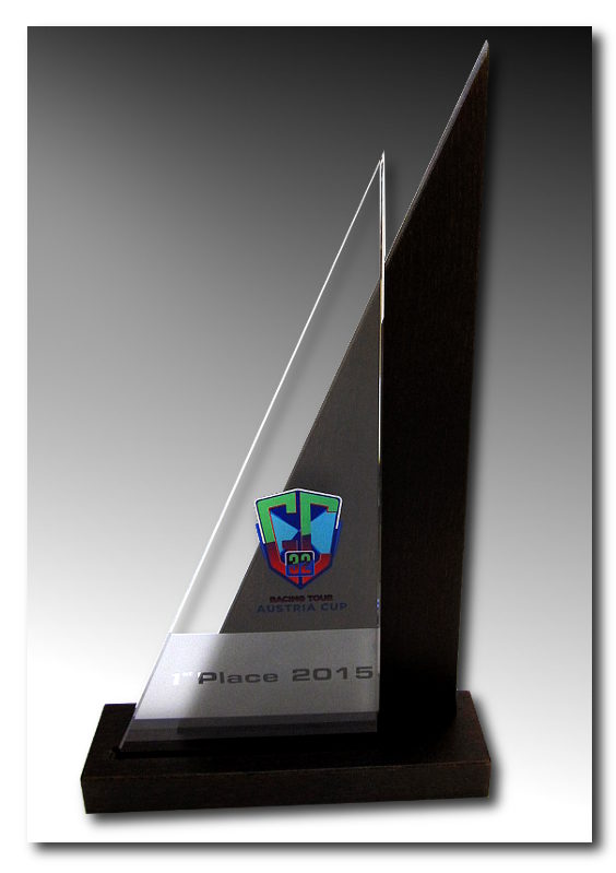 Hohe Holz/Glastrophäe. Der Glasteil ist sandgestrahlt und mit UV-Druck versehen.