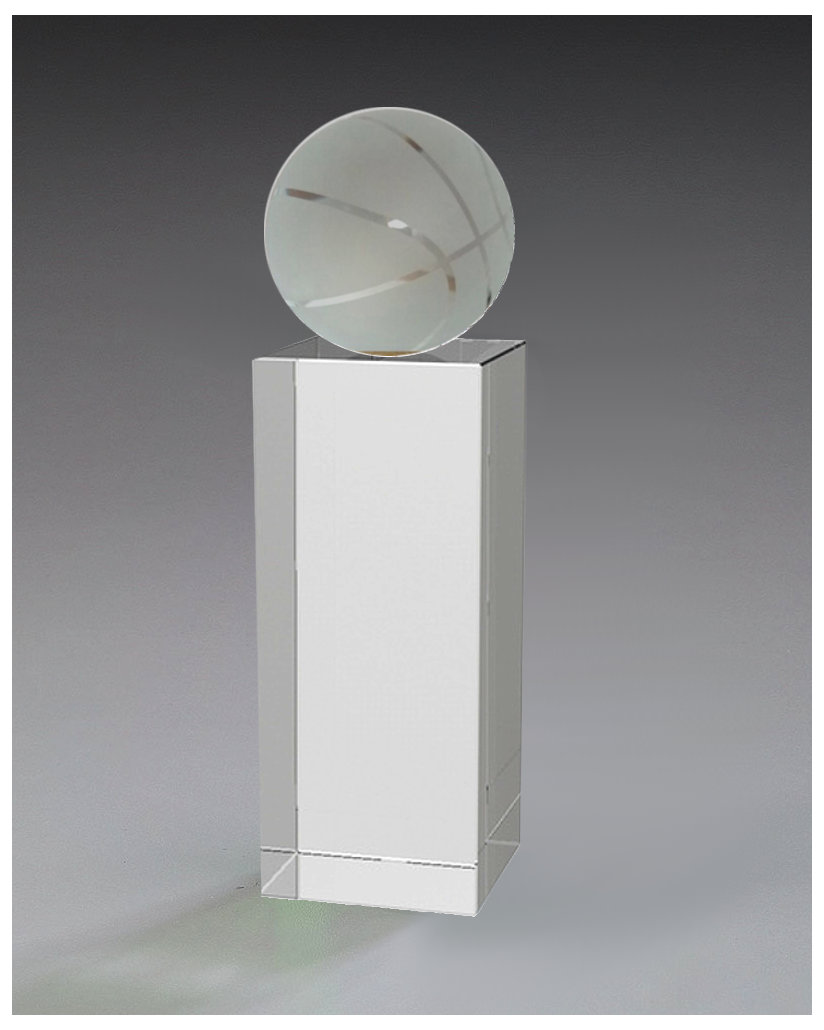 Glaspokal bestehend aus einem Glasquader und einem Basketball aus Glas