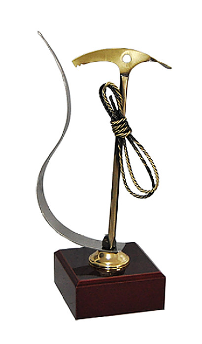 Moderne Trophäe für den "BESTEN BERGSTEIGER" in Metallausführung, auf Holzsockel montiert.