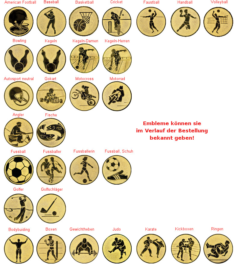 Embleme sind vorgefertigte Ronden (5cm und 2.5cm), die in Medaillen und Pokale mit Emblemhalter eingeklebt werden können.